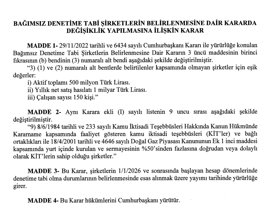 29/11/2022 tarihli ve 6434 sayılı Cumhurbaşkanı Kararı ile yürürlüğe konulan Bağımsız Denetime Tabi Şirketlerin Belirlenmesine Dair Karar’ın 3’üncü maddesinin birinci fıkrasının (b) bendinin (3) numaralı alt bendindeki şirketler için bağımsız denetim ölçütleri 01.01.2026 tarihinden geçerli olmak üzere güncellendi.